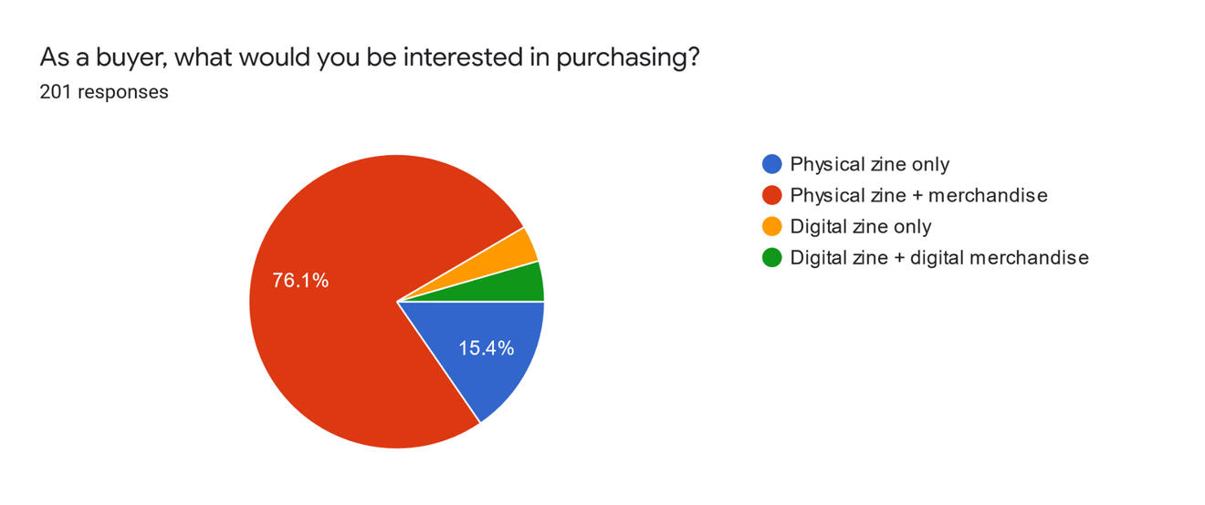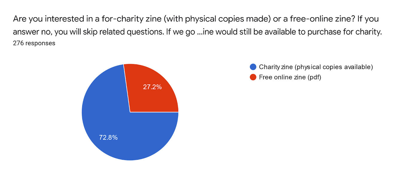 201 respondents were interested in a physical zine where proceeds would do to charity (72.8%)