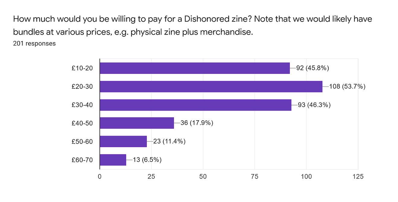 Most people would pay between £10-40 for a zine + merch, so we will aim for several tiers of bundles available to purchase across this range
