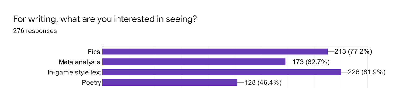 Writing - interest in short fics, meta analysis, in-game style text and poetry